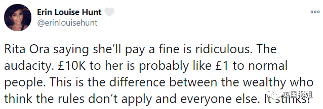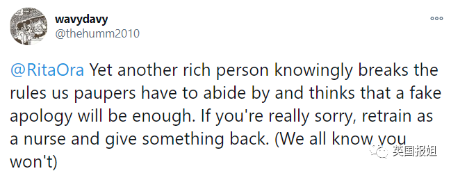 “Rita Ora,又一个有钱人故意违反规则,规则怕是只有我们穷人才不得不遵守的,而且她还认为一个虚假的道歉就足够弥补一切了。