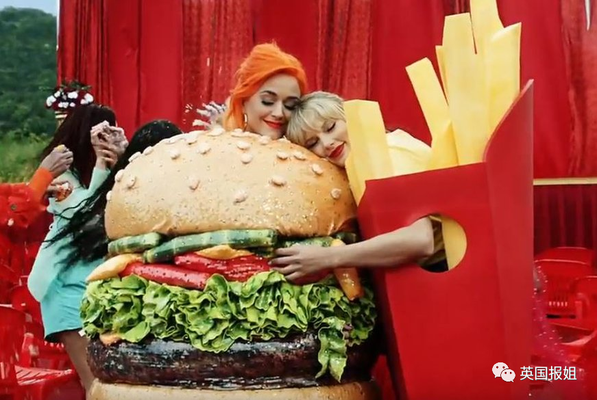 还有《You need to calm down》的MV,她和水果姐在片子里打扮成薯条和汉堡,变成“天生一对”温馨地拥抱在一起,让以前的不和传言烟消云散。