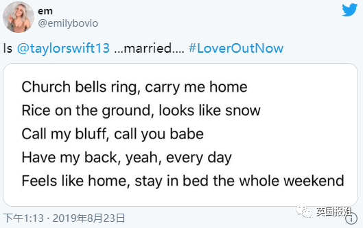 去年专辑《Lover》里的一些歌词也让粉丝们想入非非: