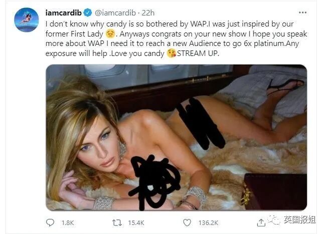来来去去其实还是在说被卡老师和马冬梅的大尺度表演冒犯到了,于是Cardi B为表示反驳,贴出了川普夫人梅拉尼娅的裸照。