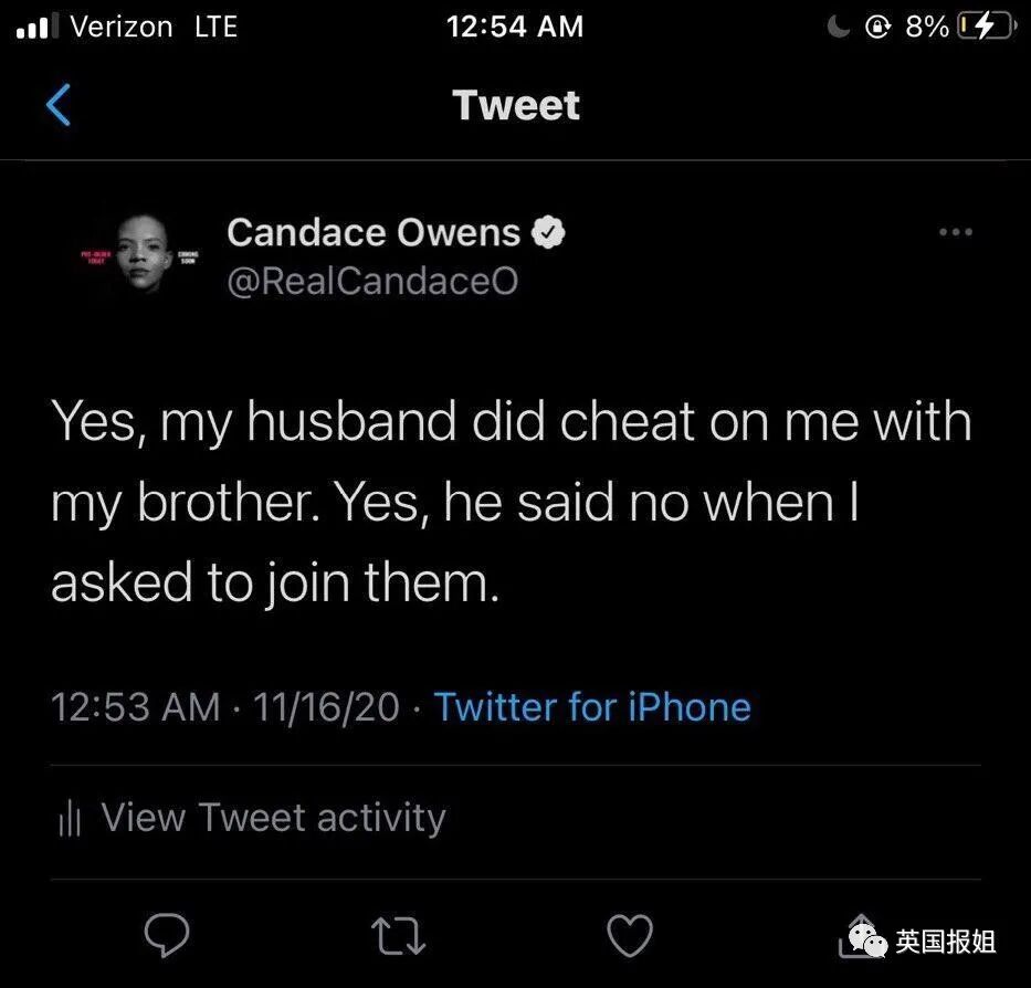 还贴上了坎迪承认“丈夫出轨弟弟”的推特截图。
