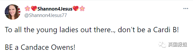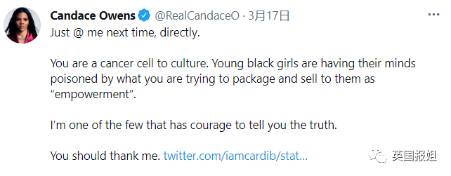 “致全天下所有的年轻女性们,不要做卡迪比,要做坎迪斯欧文斯!”