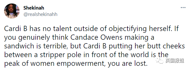 “卡迪比除了物化自己,没有别的才能。如果你真的认为坎迪(为丈夫)做三明治很糟糕,但卡迪比当着全世界的面,把屁股蛋子夹在一根钢管之间却是女性权力的巅峰,那你就错了。”
