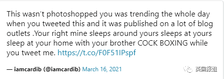哦豁!这明显就是在说卡老师的丈夫Offset多次出轨了,双方都拽了对方的家人下场,火药味越来越浓。