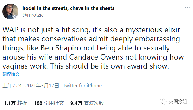 它让保守派人士承认了一些极为尴尬的事情,比如Ben Shapiro没法唤起他老婆的性冲动,而坎迪不知道阴道是怎么回事。真的应该给WAP单独办个颁奖典礼。”