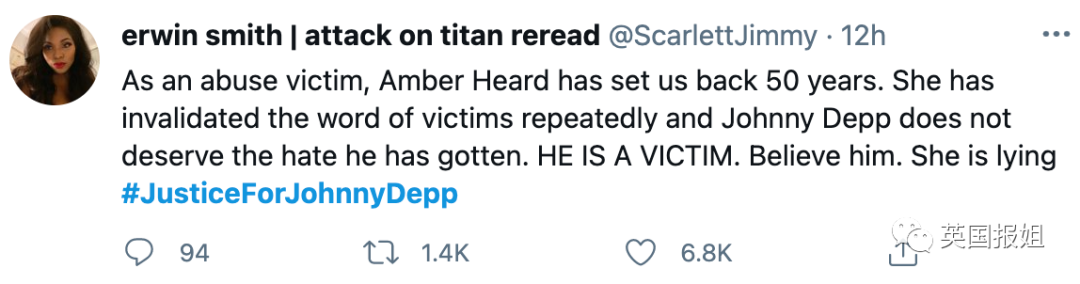 “作为一个家暴受害者,艾梅柏让我们倒退了50年。她一再将受害者的证词无效化,德普不应该受到他这么多的仇恨。他才是受害者。相信他。她在撒谎!”