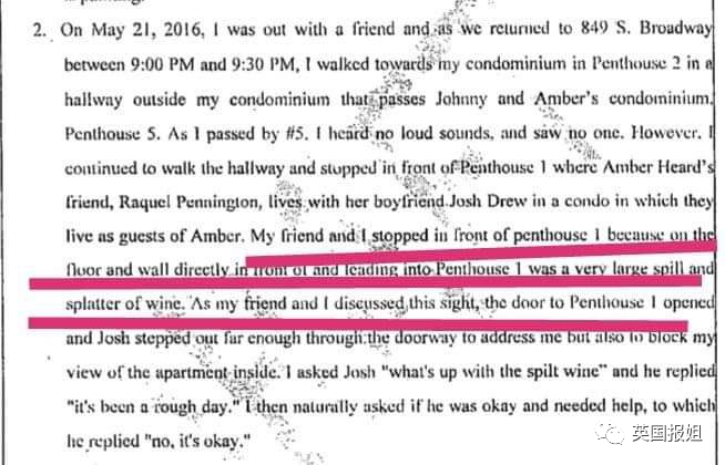 首先德普方面,住在2号公寓的证人,也曾在证词中确认:2016年5月21日这天,在路过5号公寓的地板上撒了很多红酒。而德普告诉他,这天过得很糟糕。
