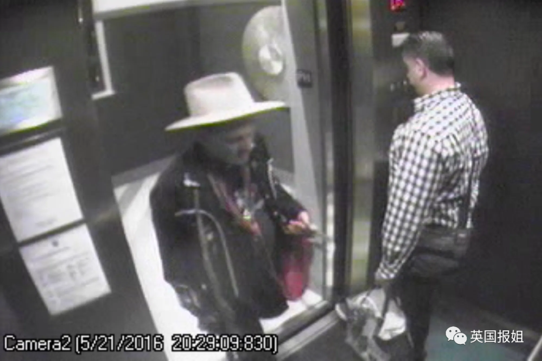电梯监控中显示两名保镖和情绪激动的德普离开
