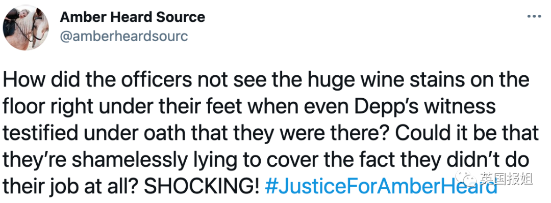 “连德普的证人都宣誓作证说有一大滩酒渍在地板上,警员们怎么会没有看到脚下的酒渍呢?难道他们也在无耻撒谎,以掩盖他们根本没有尽职的事实?震惊!”