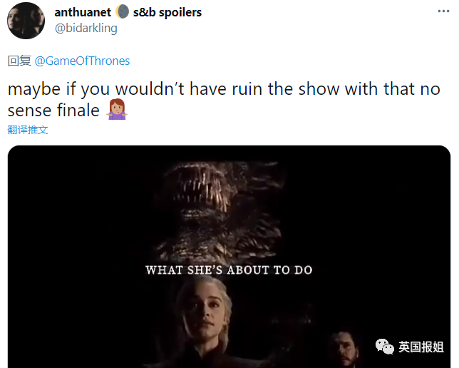 “这部剧十年来一直都保持着复杂精彩的人物和故事线,无与伦比…结果却被两个想拍《星球大战》的傲慢编剧毁了,他俩最后还被炒了鱿鱼。”