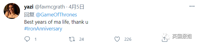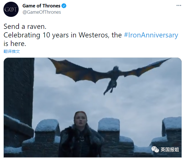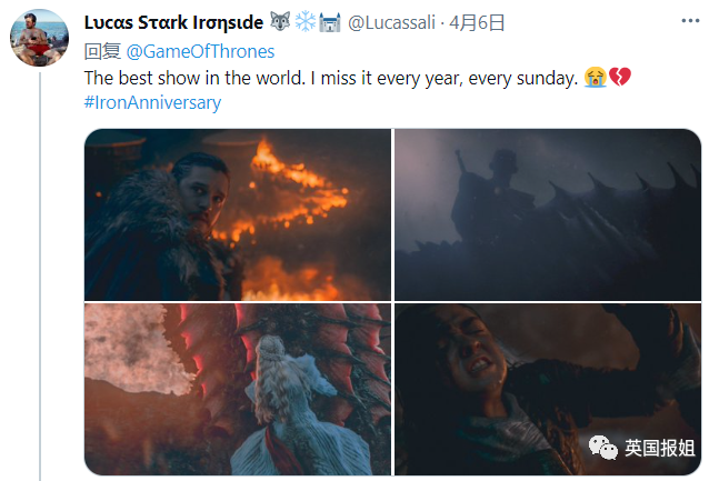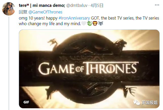 “天哪十年了!十周年快乐,《权力的游戏》,最好的电视剧,改变了我的生活,也改变了我的思想。”