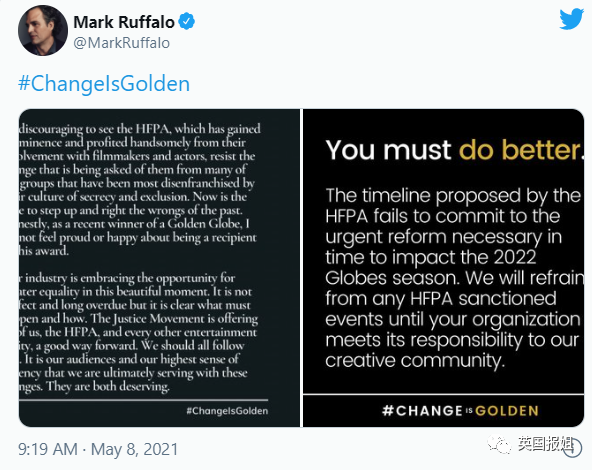紧接着,寡姐的接力棒被马克叔Mark Ruffalo接过。他批评HFPA的行为是令人失望的,并且支持寡姐抵制HFPA。并表示HFPA的行为,让自己作为金球奖得主感到羞耻。