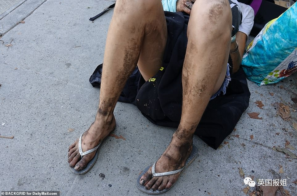 她的手臂,腿,脚趾和指甲沾满了污垢,手臂上有开放性伤口,手指严重受伤。她被发现在好莱坞一处垃圾桶里翻找食物,身边推着一辆装满废品的购物车。