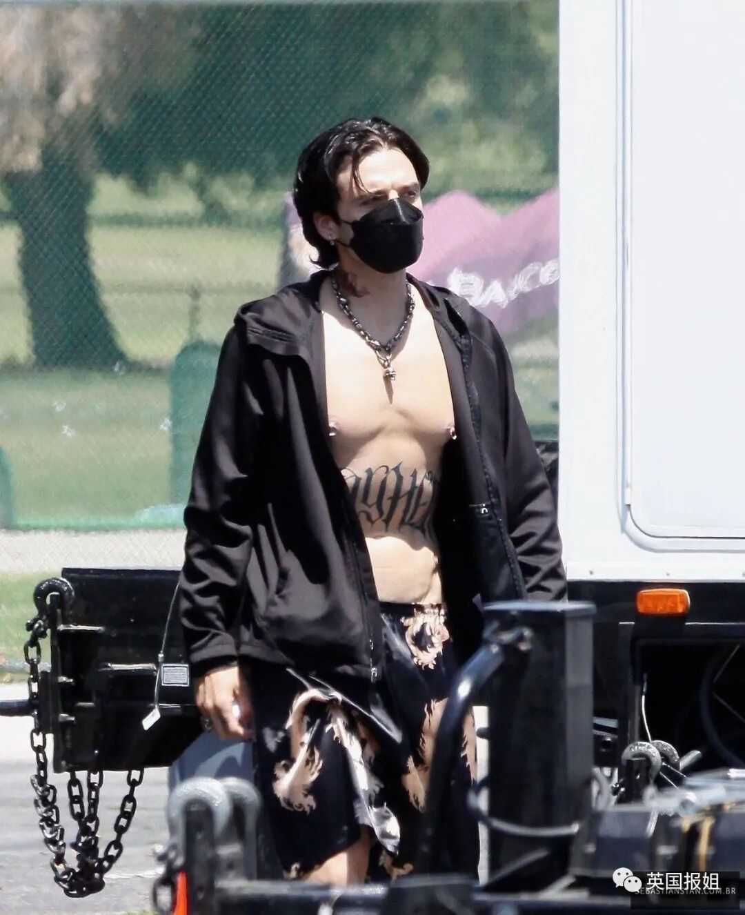 黑色上衣大敞着,露出同样发光的金属乳钉,还有大片文身。
