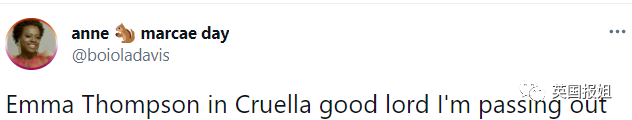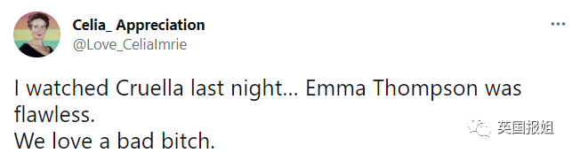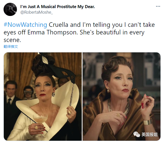 “看了《库伊拉》,我必须得说,全程我的眼睛都没能离开艾玛汤普森,她每一帧都好美。”