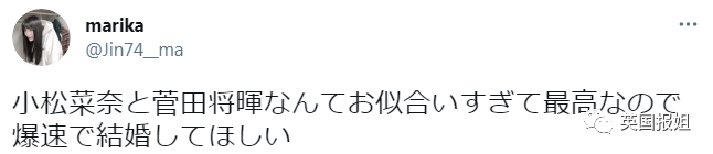 “小松菜奈和菅田将晖太般配了吧,希望二位火速结婚。”