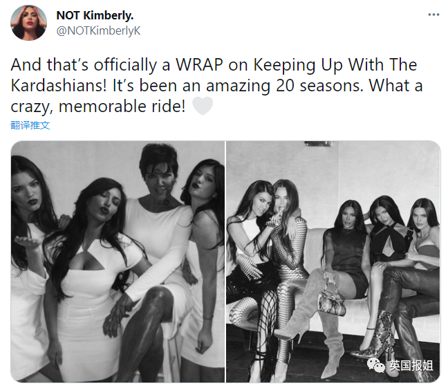 “《与卡戴珊同行》正式完结啦!过去的20季都非常棒。多么疯狂而又值得铭记的旅程啊!”