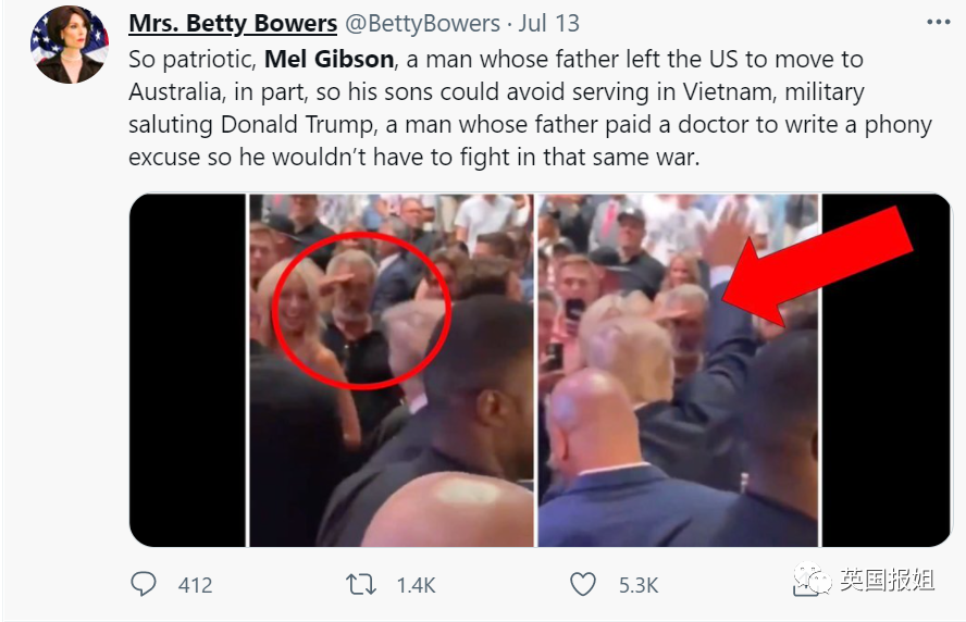 网友嘲讽道,敬军礼的梅尔吉布森,当年从出生地美国突然全家搬去澳洲,原因之一就是他爸为了帮他逃过越战的兵役。巧了,被致敬的川普,他爸也曾给他买假病例逃过同一场兵役,简直就是两个垃圾臭味相投。