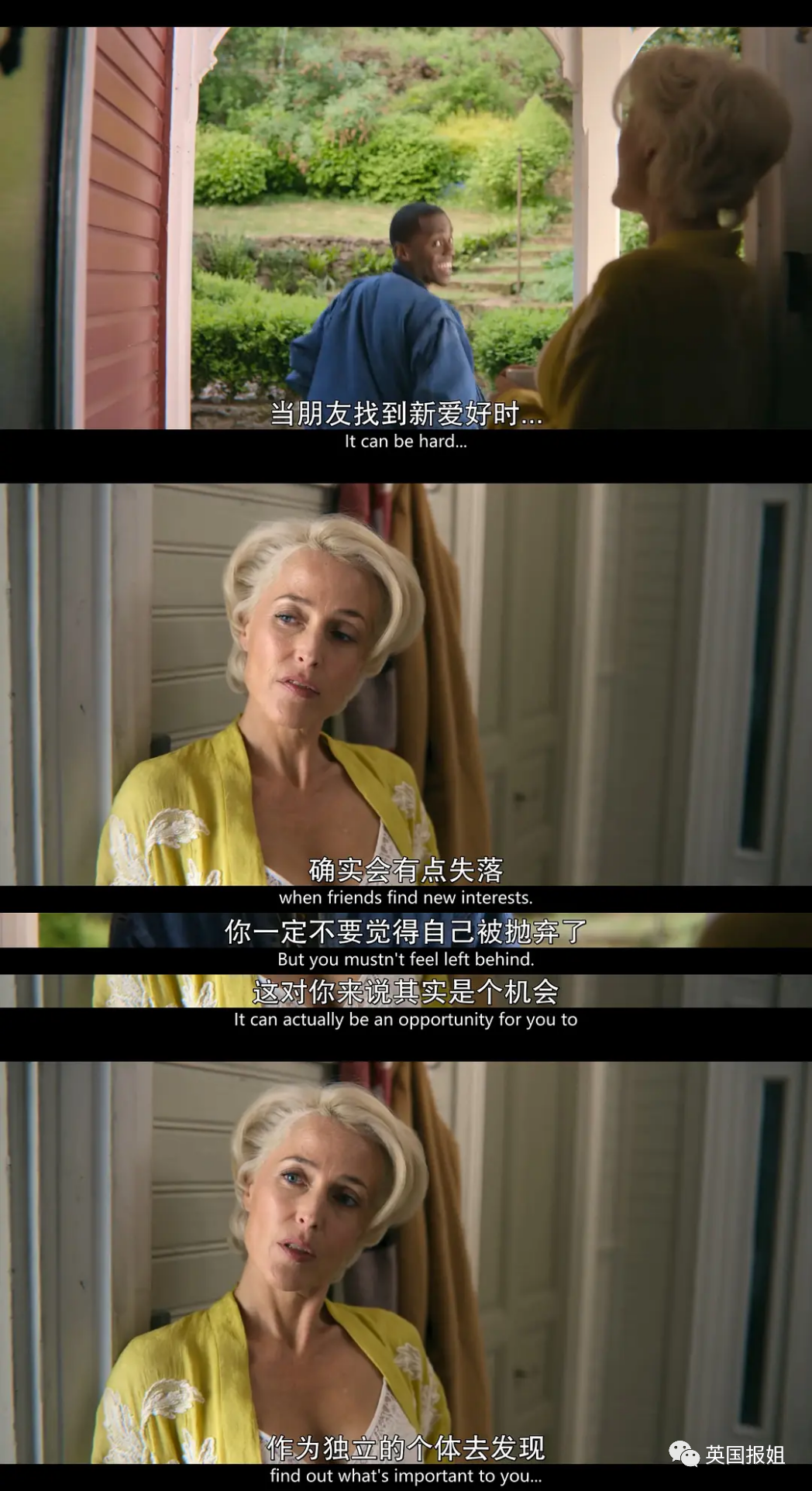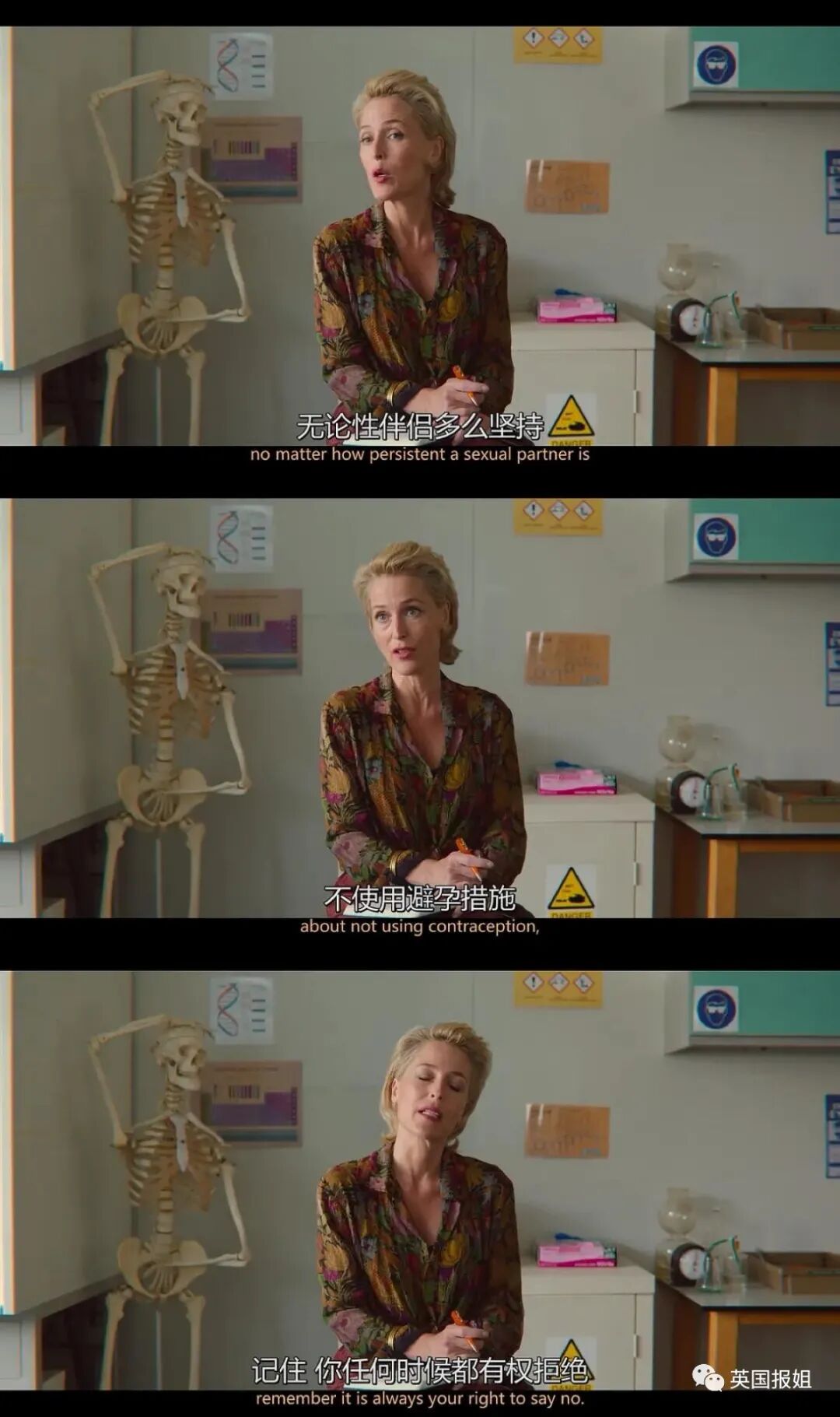 话说回来,这样的女王行为倒还蛮符合安德森在电视剧《性教育》里的人设。她在剧里扮演男主的妈妈Jean,是一位专业的性治疗师。