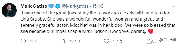 《神夏》联合创作者马克·加蒂斯:“我们很幸运,她成为了我们不朽的哈德森夫人。再见了,我亲爱的。”