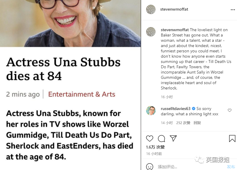 “夏洛克”本尼迪克特·康伯巴奇第一时间表达了对Una的悼念: