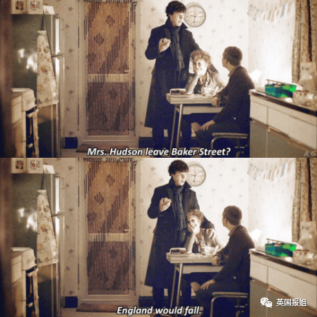 Mrs. Hudson leave Baker Street? England would fall.(哈德森太太怎么能离开贝克街?不然英国可要沦陷了。)