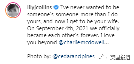 9月初,有“当代赫本”之称的莉莉·柯林斯晒出婚纱照宣布自己嫁了,与导演查理·麦克道威尔喜结连理。