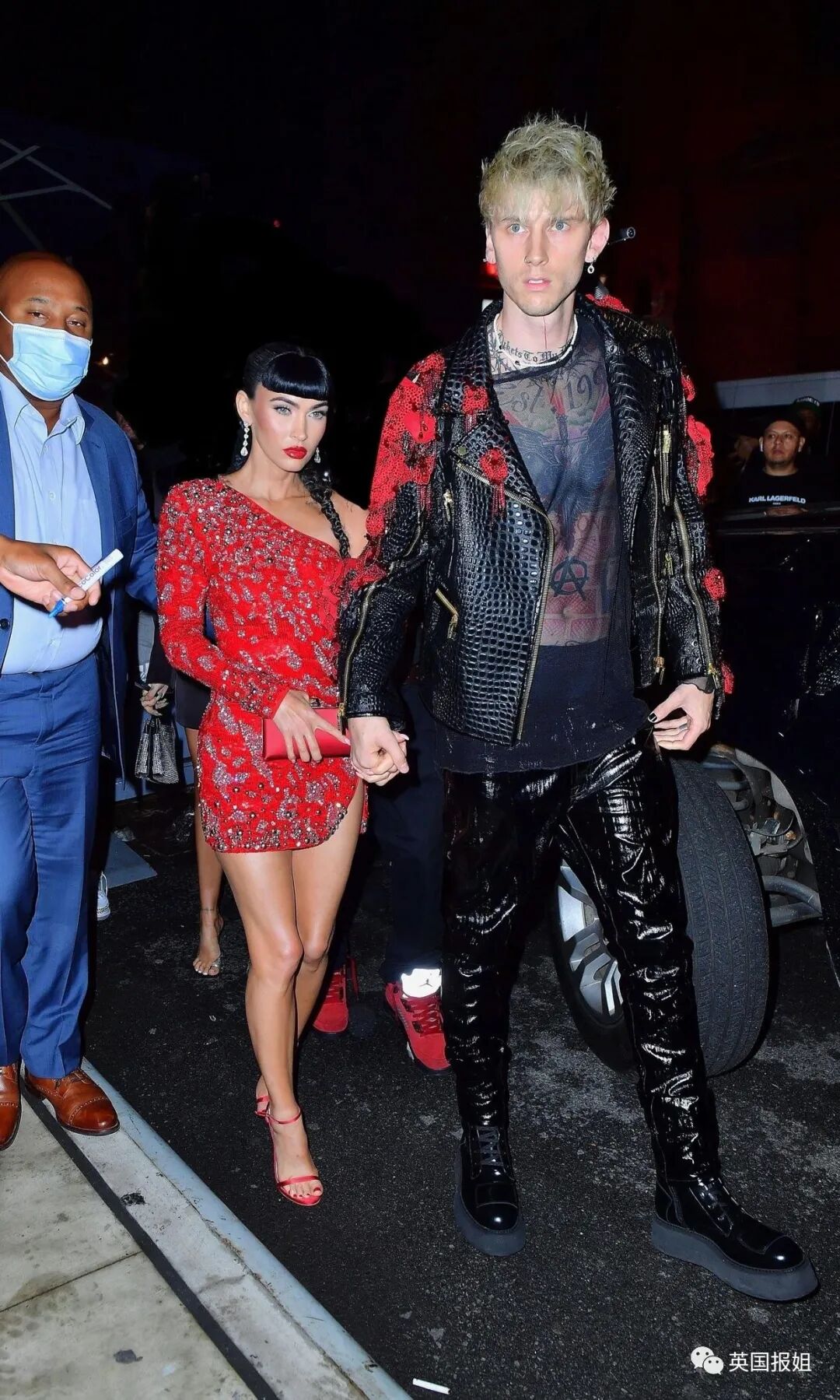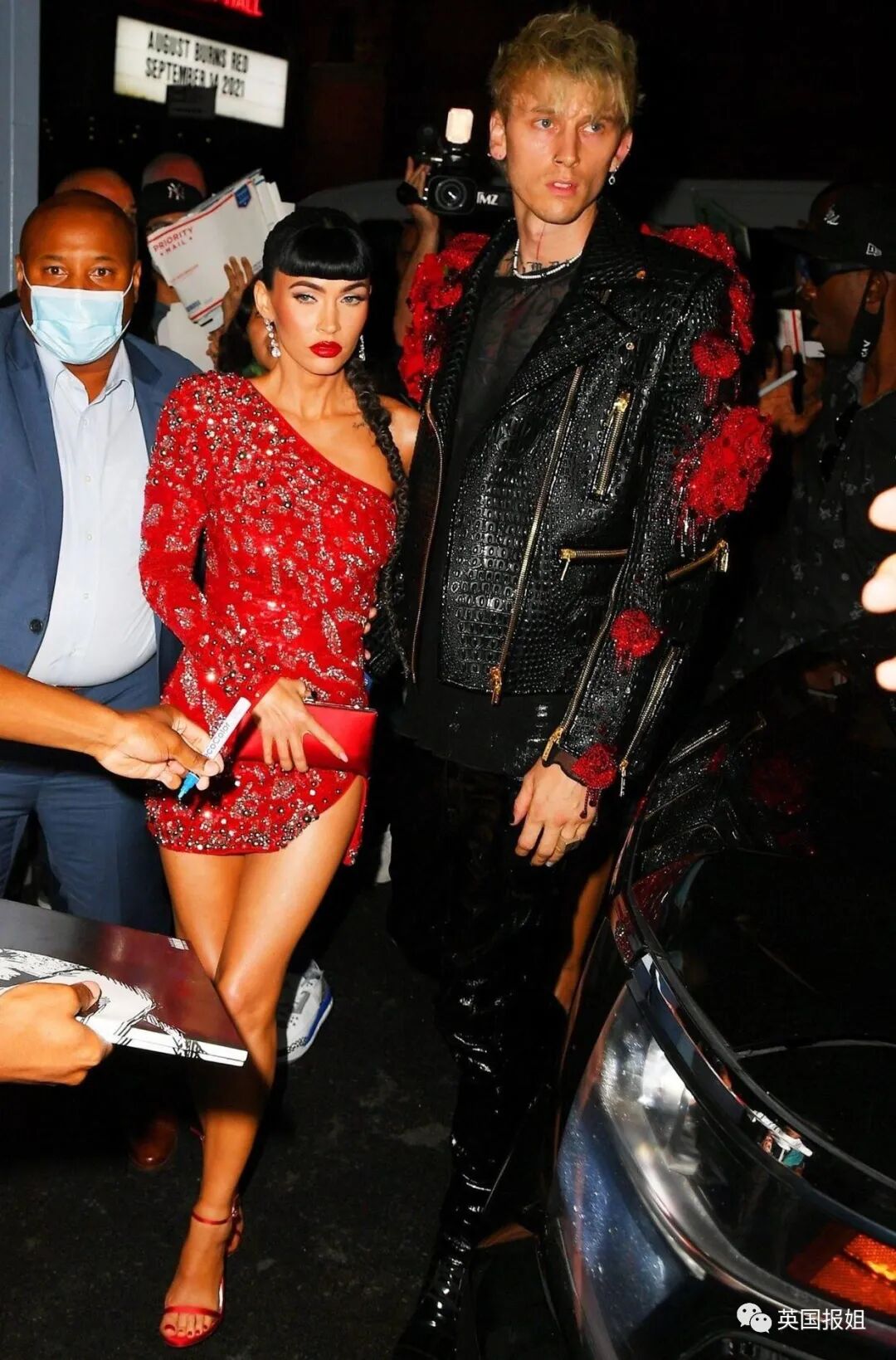 一身红色闪光西装的MGK站在她旁边,都成了配饰。