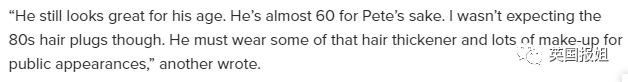 “以他的年龄来说,他看起来还是很好的。求求了,他都快60岁了。不过他这个80年代的头发是怎么回事,他在公众场合还是多涂一些增发剂和化妆品吧。”