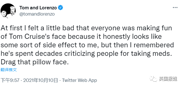 “刚开始我还觉得大家都在嘲阿汤哥的脸有点不太好,因为老实说,我觉得这脸看起来像是(吃药后的)某种副作用。但是我后来想,他批评别人吃药可是批评了好几十年呢。”