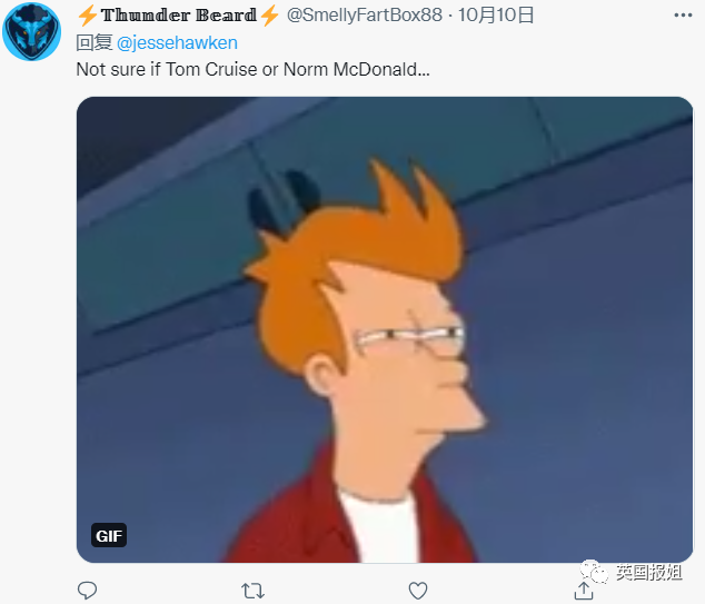 “盯————不确定他到底是阿汤哥还是Norm Macdonald...”