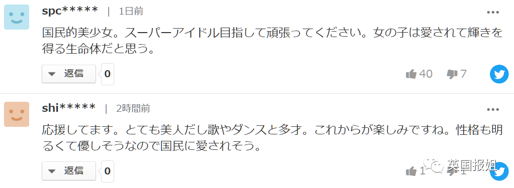 “是国民美少女了!希望能以偶像为目标持续努力,女孩子真的是被爱与光辉笼罩的生物哇!”