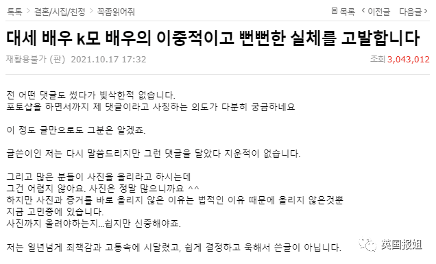 一位男演员的前女友匿名在论坛发帖,帖子的题目是《揭露大势演员K某的无耻双重真面目》。