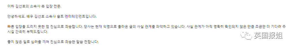 到最开始的帖子发出大约两天后,金宣虎经纪公司的声明才姗姗来迟,而且并没有给出任何明确的回答。