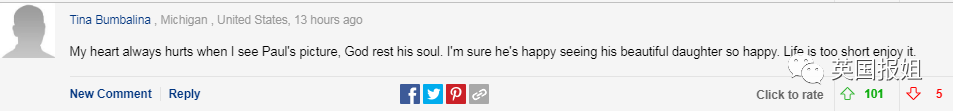 “每当我看到保罗的照片时,总是很心痛,RIP。相信他看到他美丽漂亮的女儿过得如此开心,一定很高兴。生命太短暂了,好好享受吧。”