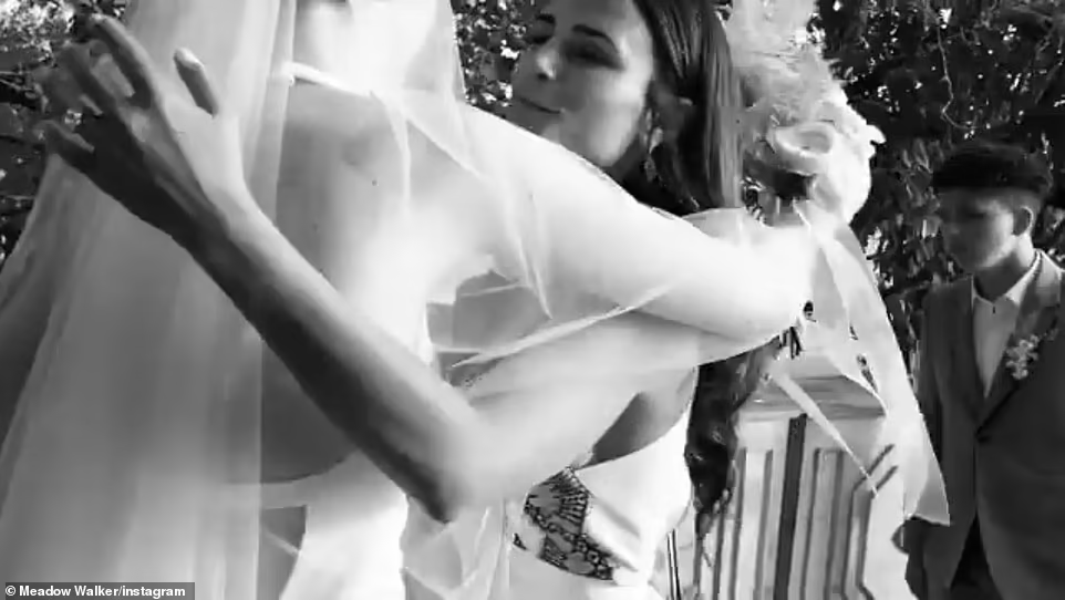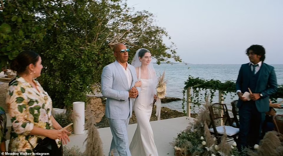 更让人关注的是,挽着梅朵走进婚礼现场的,竟是保罗·沃克生前挚友,也是梅朵的教父——范·迪塞尔。