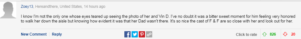 “我知道我不是唯一一个看到她和范·迪塞尔的照片后感动落泪的人。这个时刻又苦涩又甜蜜,他看起来非常荣幸能陪她走过红毯,也清楚地知道她的父亲不在婚礼现场。《速度与激情》的演员们能和她如此亲近,并为她着想,真是太好了。”