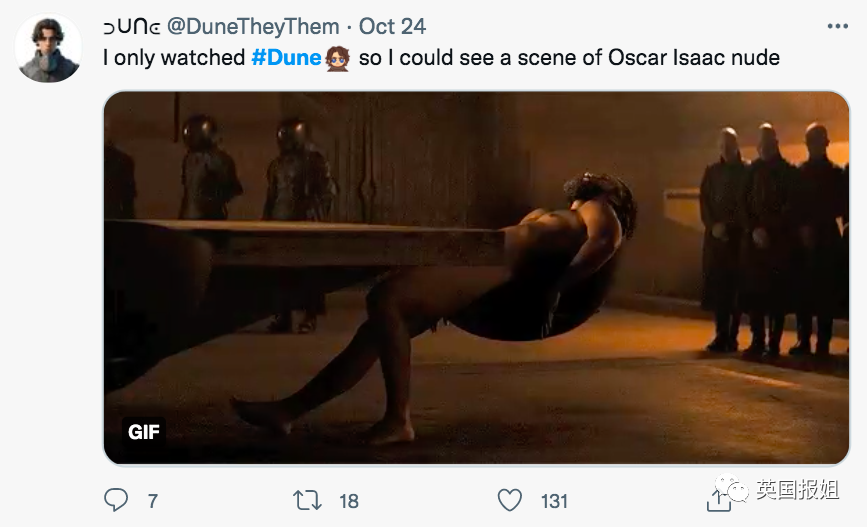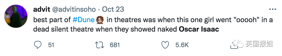 “看《沙丘》最棒的一刻,奥斯卡·伊斯卡全果的时候,有个姑娘在死寂的电影院里感叹‘哇噢~~~’。”