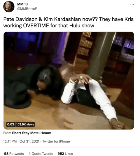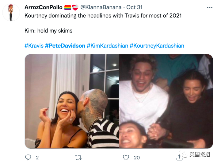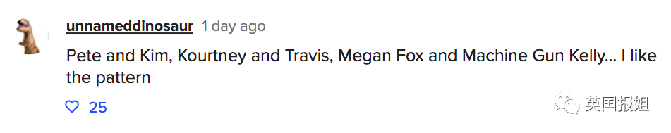 也有网友cue到了金姐朋友圈的「富婆姐姐x放纵不羁的音乐人」组合:“皮特和金姐、考特妮和特拉维斯、梅根·福克斯和MGK,我喜欢这种CP组合。”