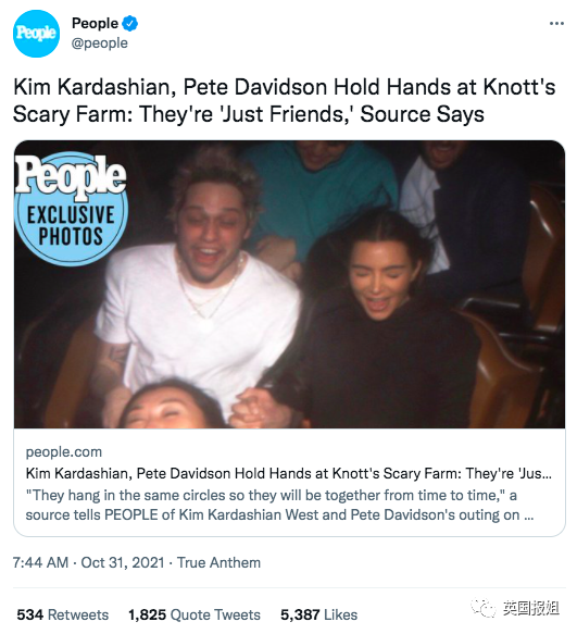 各家争鸣出门遛弯的同时,有个新闻着实让不少吃瓜群众吓一跳:10月30日晚,金·卡戴珊(以下简称金姐)和皮特·戴维森被拍到牵手玩过山车!