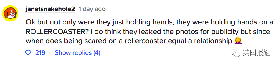 “Ok,他们牵手了,在过山车上牵的?我确实觉得他们是为了曝光率泄露的照片,但啥时候开始坐过山车牵手就等于谈恋爱了?”