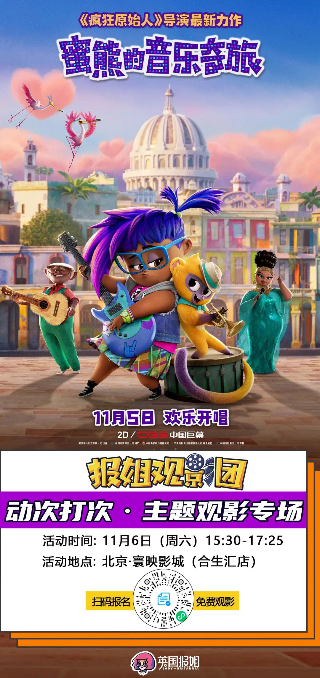 【报姐观影团】这周六(11月6日)在北京,一起来看《疯狂原始人》原班人马打造的音乐电影《蜜熊的音乐奇旅》,现场体验音乐带来的欢快和治愈吧!报名方式在文章结尾处,等你参加!