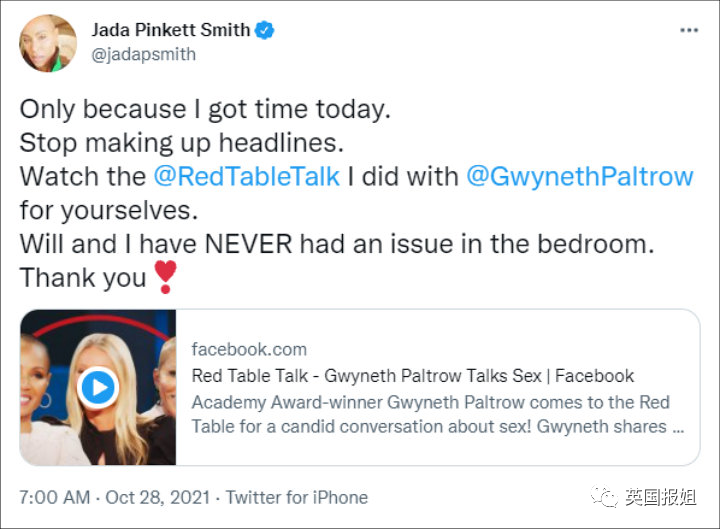 “今天有空我就澄清一下,Will和我的亲密生活从没出现过什么问题。谢谢你们关心!”