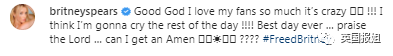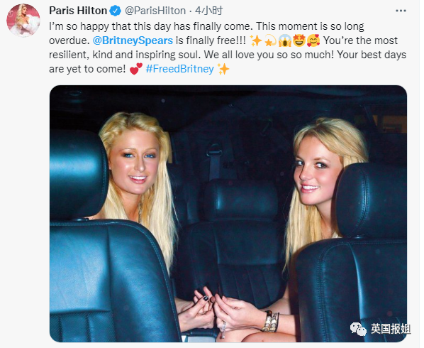 好友帕丽斯·希尔顿也感慨:“布兰妮终于自由了!!!!你的好日子还在后头呢!”