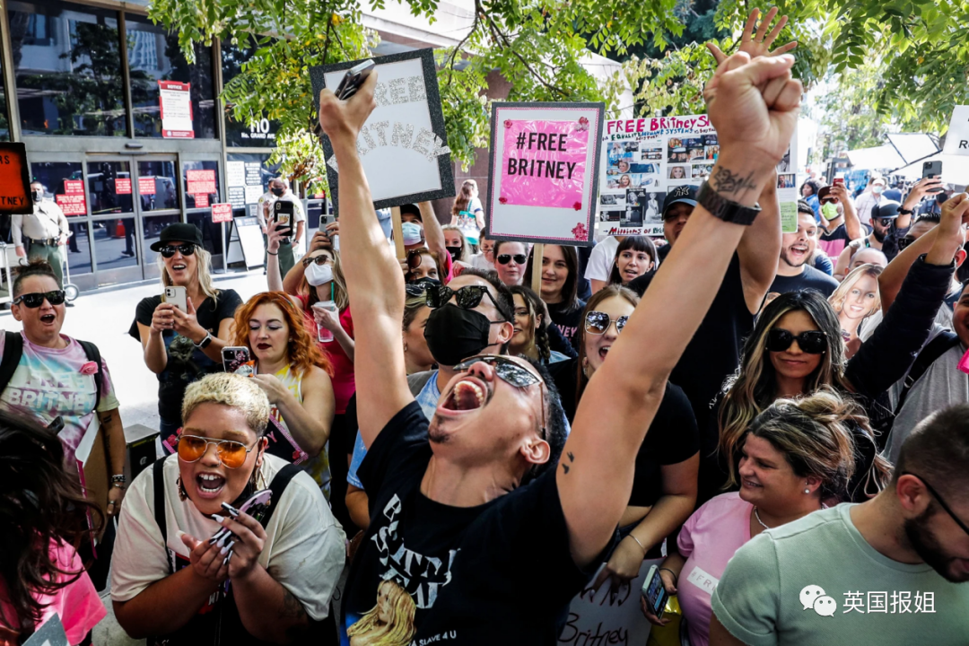 法院外,印着“解放布兰妮”的彩旗随风飘动,数百名前来支持她的粉丝在知道裁决结果后,爆发出了一阵又一阵的欢呼声。
