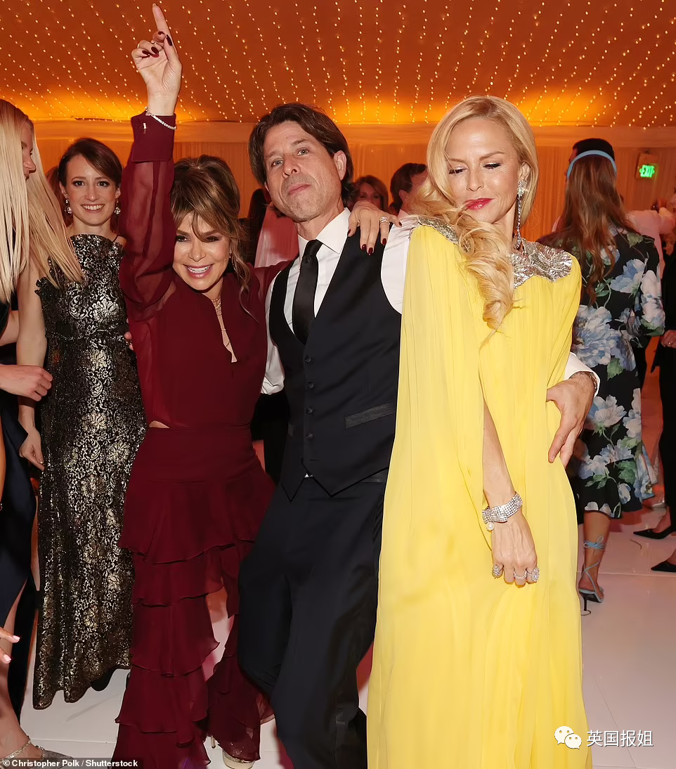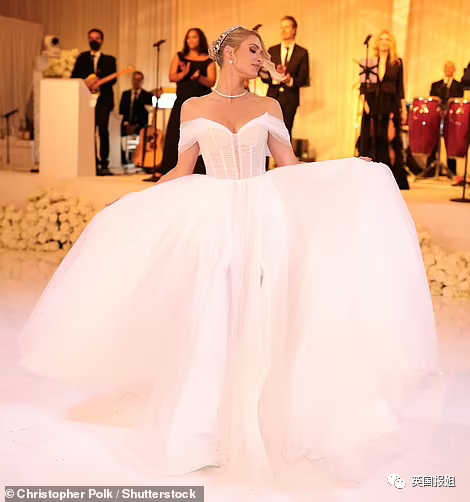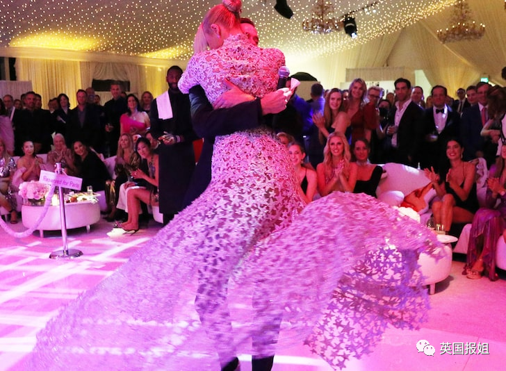 舞会上,帕里斯换下主婚纱,穿上一件露肩晚礼服,和新郎跳了第一支舞。
