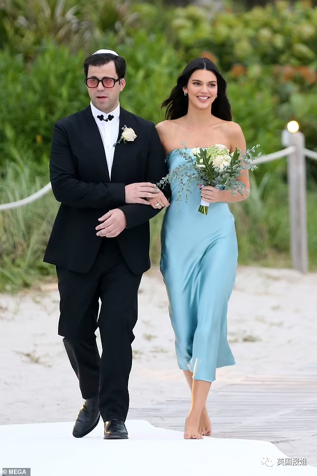 她和贝拉·哈迪德都是伴娘团的一员,统一手捧鲜花,穿着浅蓝色的真丝礼服。
