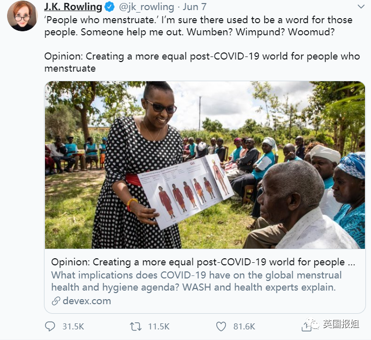 她的言论引起了轩然大波,因为将“来月经的人=女性”,实际上,是否定跨性别者的存在。