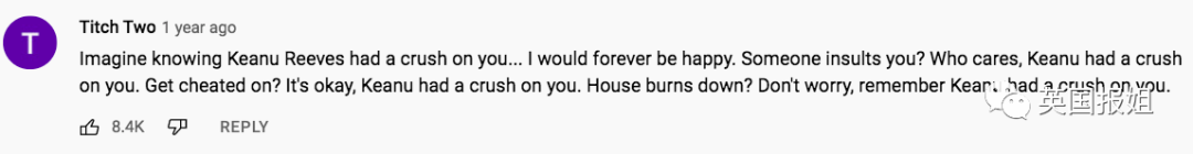“想象一下,基努·里维斯喜欢你…我这辈子都会乐坏的。有人骂了你?没关系,基努喜欢你。被劈腿了?没关系,基努喜欢你。房子烧坏了?记住,基努喜欢你。”