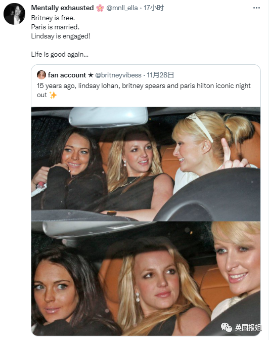 有人搬出15年前,林赛和布兰妮、帕里斯·希顿三人的经典照片发出感慨万千:
